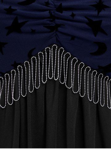 a*****75Plus Size Gothic Moon Star Print Mesh Panel Bell Sleeves Ruched Chain Tassel Long Sleeves T-shirtColor: DEEP RED Size: 4X | US 26-28This top is beautiful and fits perfectly. I haven't gotten to wear it out yet, but it's going to be a compliment-catcher, I can already tell. Love the star and moon motif, and the tiny beaded trim is an elegant touch.