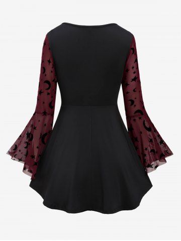 Plus Size Gothic Moon Star Print Mesh Panel Bell Sleeves Ruched Chain Tassel Long Sleeves T-shirt - Deep Red - 5x | Us 30-32