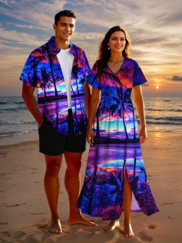Matching Hawaiian Outfits > Coconut Tree Colorful Cloud Seascape Print Plus Size Matching Hawaii Beach Outfit For Couples