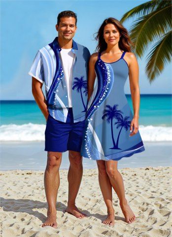 Matching Hawaiian Outfits > Coconut Tree Curve Colorblock Print Plus Size Matching Hawaii Beach Outfit For Couples