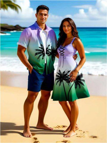 Matching Hawaiian Outfits > Coconut Tree Dip Dye Ombre Print Plus Size Matching Hawaii Beach Outfit For Couples