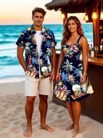 Matching Hawaiian Outfits > Coconut Tree Hibiscus Flower Beer Shell Print Plus Size Matching Hawaii Beach Outfit For Couples