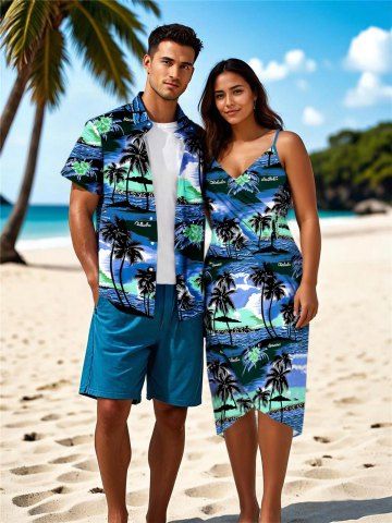Matching Hawaiian Outfits > Coconut Tree Hibiscus Flower Seascape Print Plus Size Matching Hawaii Beach Outfit For Couples