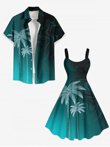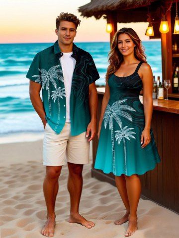Matching Hawaiian Outfits > Coconut Tree Ocean Currents Print Plus Size Matching Hawaii Beach Outfit For Couples