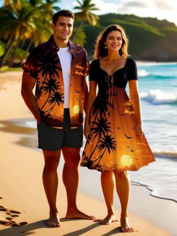 Matching Hawaiian Outfits > Coconut Tree Ombre Dusk Sunset Print Plus Size Matching Hawaii Beach Outfit For Couples