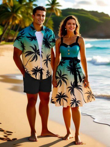 Matching Hawaiian Outfits > Coconut Tree Ombre Print Plus Size Matching Hawaii Beach Outfit For Couples