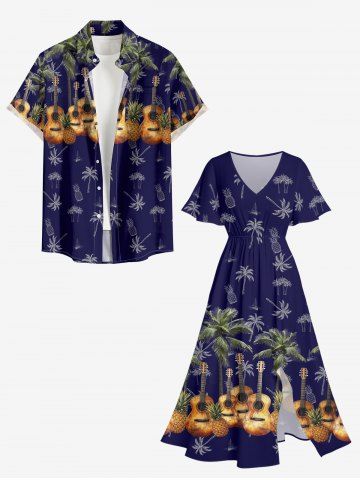 Matching Hawaiian Outfits > Coconut Tree Pineapple Guitar Print Plus Size Matching Hawaii Beach Outfit For Couples