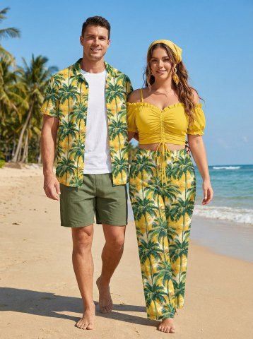 Coconut Tree Print Plus Size Matching Hawaii Beach Outfit For Couples - Yellow