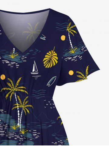 Coconut Tree Sailboat Moon Print Plus Size Matching Hawaii Beach Outfit For Couples - Navy Blue