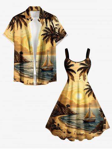 Matching Hawaiian Outfits > Coconut Tree Sailboat Sea Sun Print Plus Size Matching Hawaii Beach Outfit For Couples