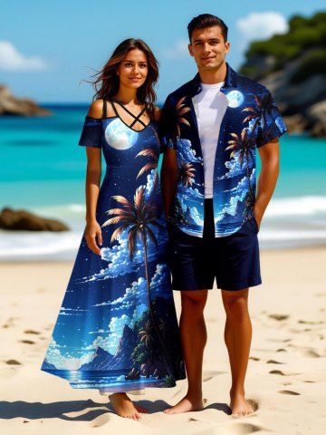 Matching Hawaiian Outfits > Coconut Tree Sea Cloud Moon Galaxy Print Plus Size Matching Hawaii Beach Outfit For Couples
