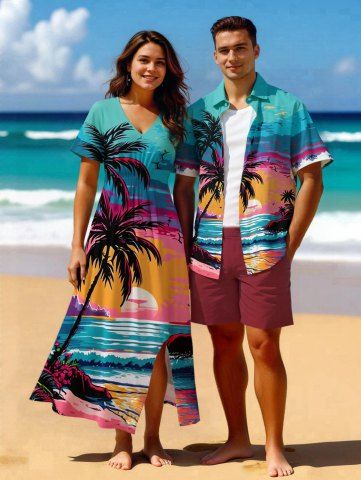 n*****i4Coconut Tree Sea Sunset Cloud Colorblock Print Plus Size Matching Hawaii Beach Outfit For CouplesColor: MULTI-AI loved the material and my girlfriend and I lived the comfort of the outfits and it fitted very well. I would recommend these outfits to family members