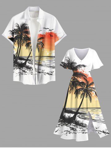 Matching Hawaiian Outfits > Coconut Tree Seascape Bird Ombre Colorblock Print Plus Size Matching Hawaii Beach Outfit For Couples