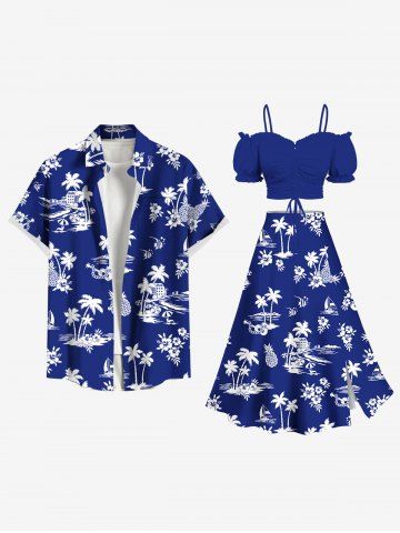 Matching Hawaiian Outfits > Coconut Tree Seascape Flowers Pineapple Print Plus Size Matching Hawaii Beach Outfit For Couples