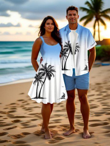 Matching Hawaiian Outfits > Coconut Tree Ship Bird Ombre Print Plus Size Matching Hawaii Beach Outfit For Couples