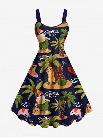 Coconut Tree Snowman Flamingo Sea Waves Print Plus Size Matching Hawaii Beach Outfit For Couples - Navy Blue