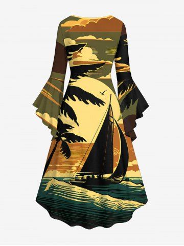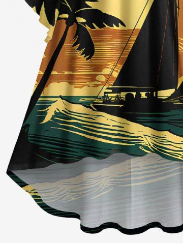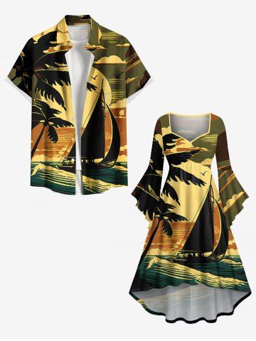 Matching Hawaiian Outfits > Coconut Tree Sun Boat Sea Waves Print Plus Size Matching Hawaii Beach Outfit For Couples