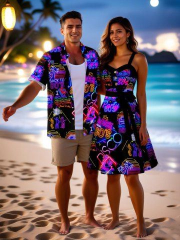 Matching Hawaiian Outfits > Coconut Tree Sun Recorder Letters Neon Print Plus Size Matching Hawaii Beach Outfit For Couples