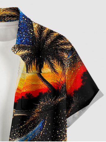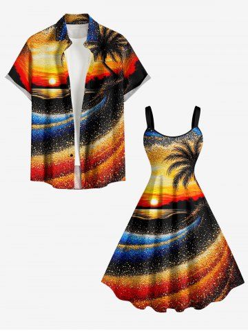 Matching Hawaiian Outfits > Coconut Tree Sun Seascape Oil Painting Print Plus Size Matching Hawaii Beach Outfit For Couples