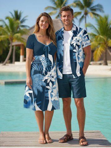 Matching Hawaiian Outfits > Coconut Tree Tropical Leaf Sea Flower Print Plus Size Matching Hawaii Beach Outfit For Couples