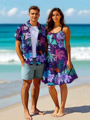 Matching Hawaiian Outfits > Colorful Coconut Tree Tropical Leaf Hibiscus Flower Print Plus Size Matching Hawaii Beach Outfit For Couples
