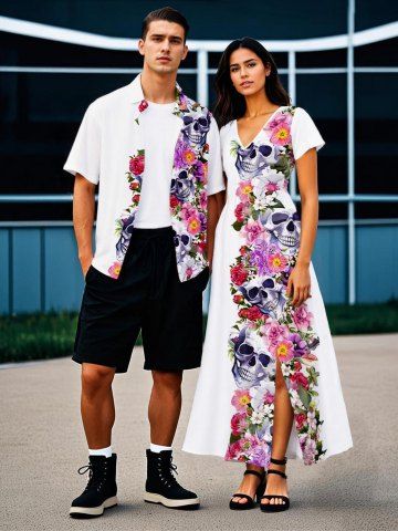 Colorful Flower Skull Print Plus Size Matching Hawaii Beach Outfit For Couples - White