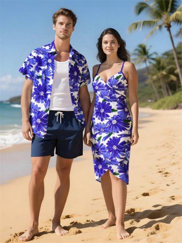 Matching Hawaiian Outfits > Daisy Flowers Print Plus Size Matching Hawaii Beach Outfit For Couples