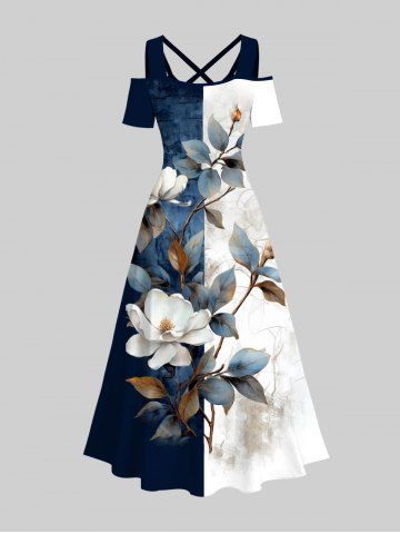 Plus Size Distressed Colorblock Flowers Leaf Print Cold Shoulder Crisscross Hawaii Maxi Dress