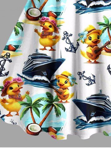 Matching Hawaiian Outfits > Ducks Coconut Tree Sea Waves Ship Anchor Cruise Print Plus Size Matching Hawaii Beach Outfit For Couples