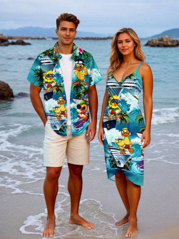 Matching Hawaiian Outfits > Ducks Ship Coconut Tree Sea Waves Print Plus Size Matching Hawaii Beach Outfit For Couples