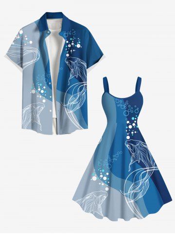 Fish Bubbles Colorblock Print Plus Size Matching Hawaii Beach Outfit For Couples - Blue