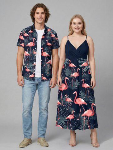 Matching Hawaiian Outfits > Flamingo Tropical Leaf Print Plus Size Matching Hawaii Beach Outfit For Couples