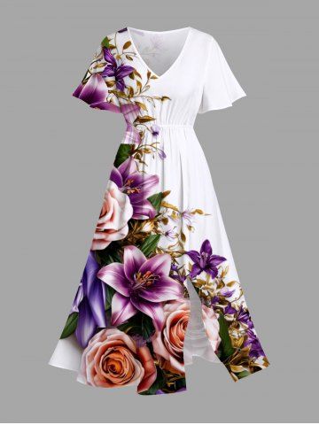Flower Leaf Print Plus Size Matching Hawaii Beach Outfit For Couples - Purple