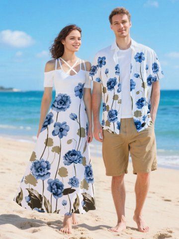Matching Hawaiian Outfits > Flower Leaf Branch Print Plus Size Matching Hawaii Beach Outfit For Couples