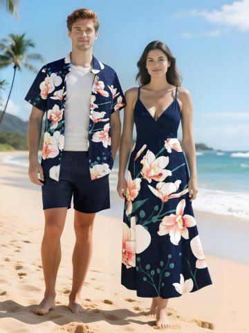 Matching Hawaiian Outfits > Flower Leaf Branch Print Plus Size Matching Hawaii Beach Outfit For Couples