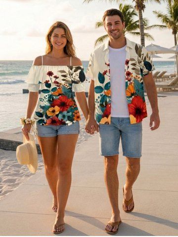 Matching Hawaiian Outfits > Flower Leaf Branch Print Plus Size Matching Hawaii Beach Outfit For Couples
