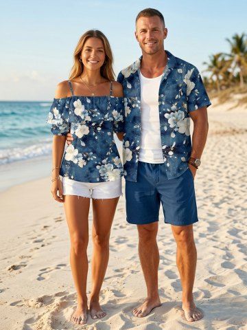 Matching Hawaiian Outfits > Flower Leaf Branch Print Plus Size Matching Hawaii Beach Outfit For Couples