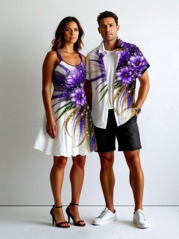 Matching Hawaiian Outfits > Flower Leaf Glitter Sequins Print Plus Size Matching Hawaii Beach Outfit For Couples