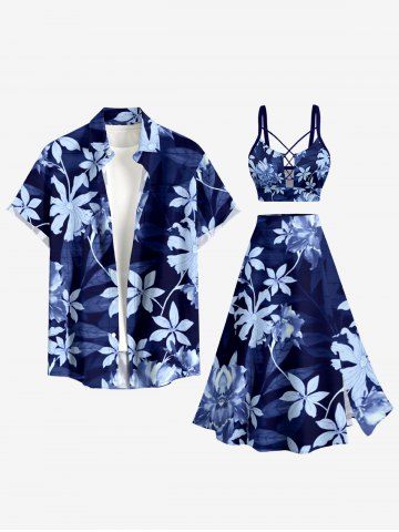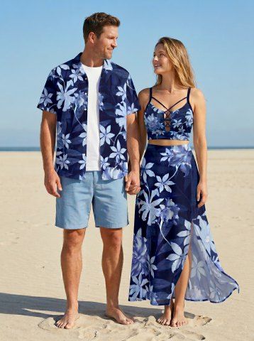 Matching Hawaiian Outfits > Flower Leaf Plant Print Plus Size Matching Hawaii Beach Outfit For Couples