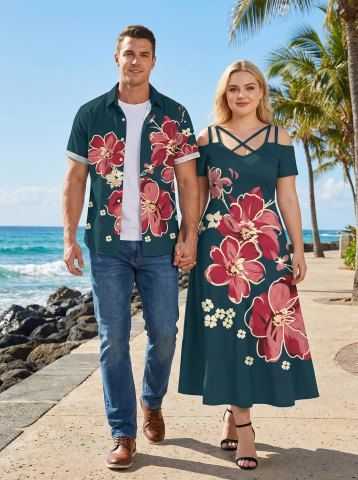 Matching Hawaiian Outfits > Flower Leaf Print Plus Size Matching Hawaii Beach Outfit For Couples