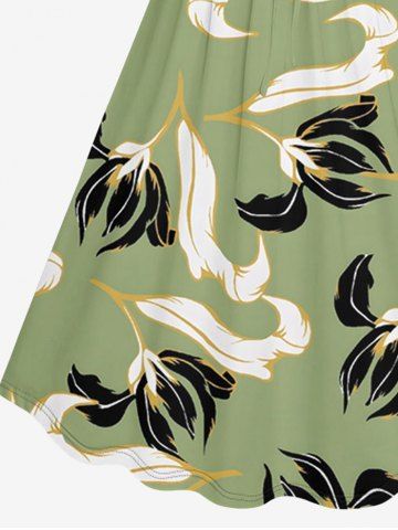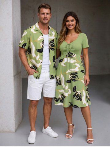 Flower Leaf Print Plus Size Matching Hawaii Beach Outfit For Couples - Light Green