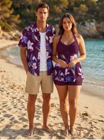 Flower Leaf Print Shirt Swimsuit Plus Size Matching Hawaii Beach Outfit For Couples - Purplish Red