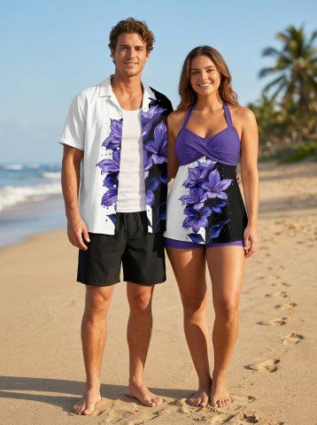 Flower Leaf Print Shirt Swimsuit Plus Size Matching Hawaii Beach Outfit For Couples - Concord