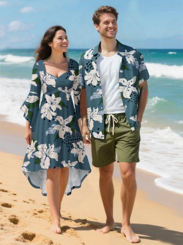 Matching Hawaiian Outfits > Flower Leaf Spotted Print Plus Size Matching Hawaii Beach Outfit For Couples