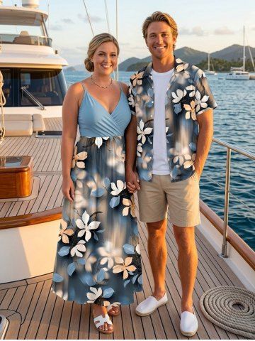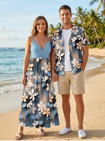 Flower Ombre Print Plus Size Matching Hawaii Beach Outfit For Couples - Blue Gray