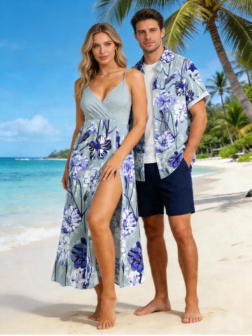 Matching Hawaiian Outfits > Flower Plant Print Plus Size Matching Hawaii Beach Outfit For Couples