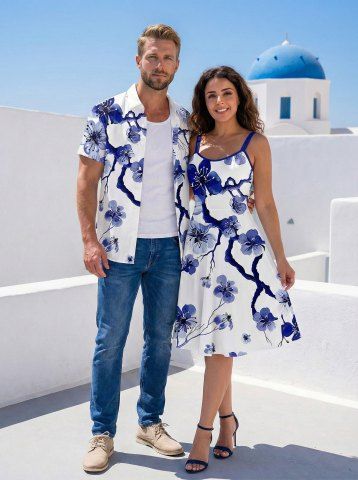 Matching Hawaiian Outfits > Flower Tree Branch Print Plus Size Matching Hawaii Beach Outfit For Couples