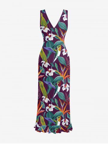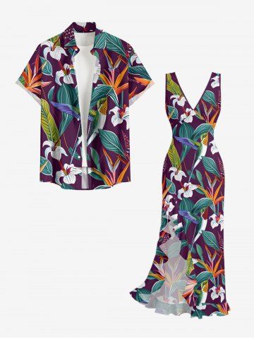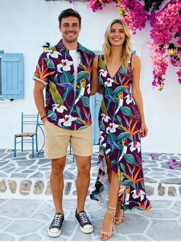 Matching Hawaiian Outfits > Flower Tropical Leaf Bird Print Matching Hawaii Beach Outfit For Couples