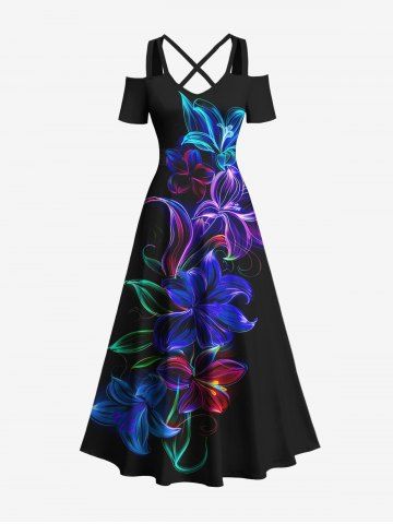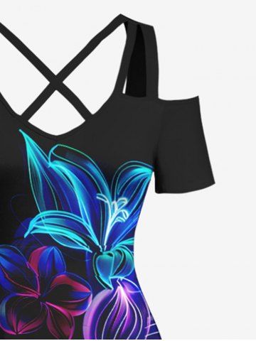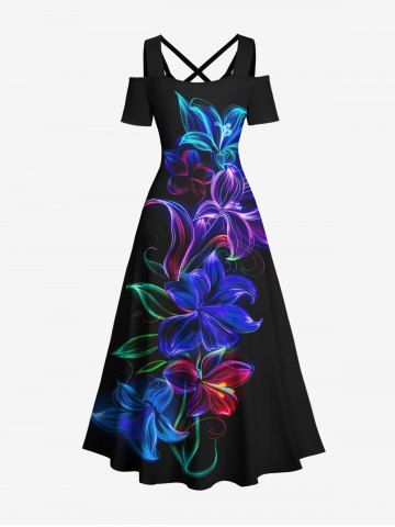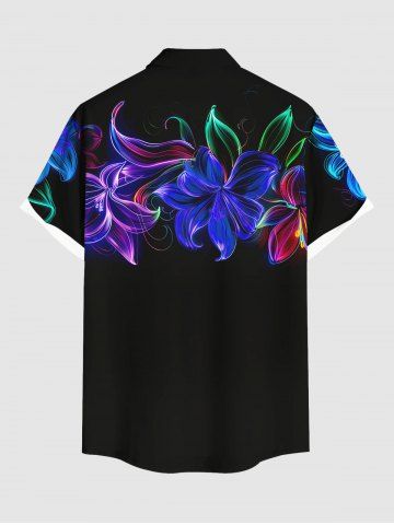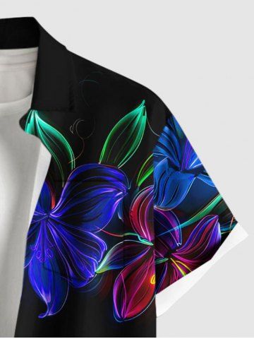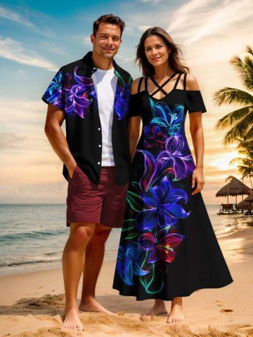 Flowers Leaf Neon Print Plus Size Matching Hawaii Beach Outfit For Couples - Black