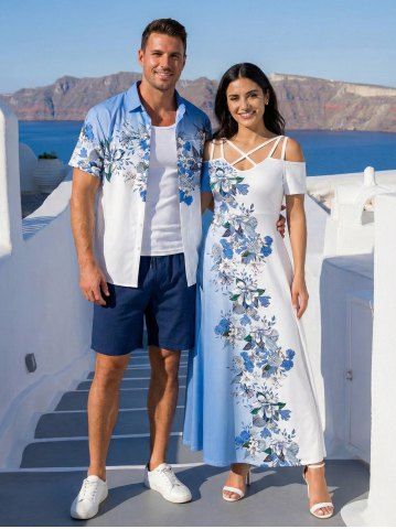 Flowers Leaf Ombre Colorblock Print Plus Size Matching Hawaii Beach Outfit For Couples - Sky Blue